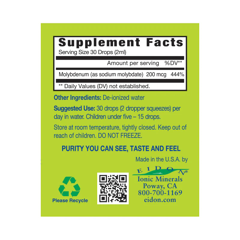 Our ability to acquire adequate levels of Molybdenum from dietary sources can be quite problematic. Eidon solves this problem with our highly bioavailable liquid ionic Molybdenum.